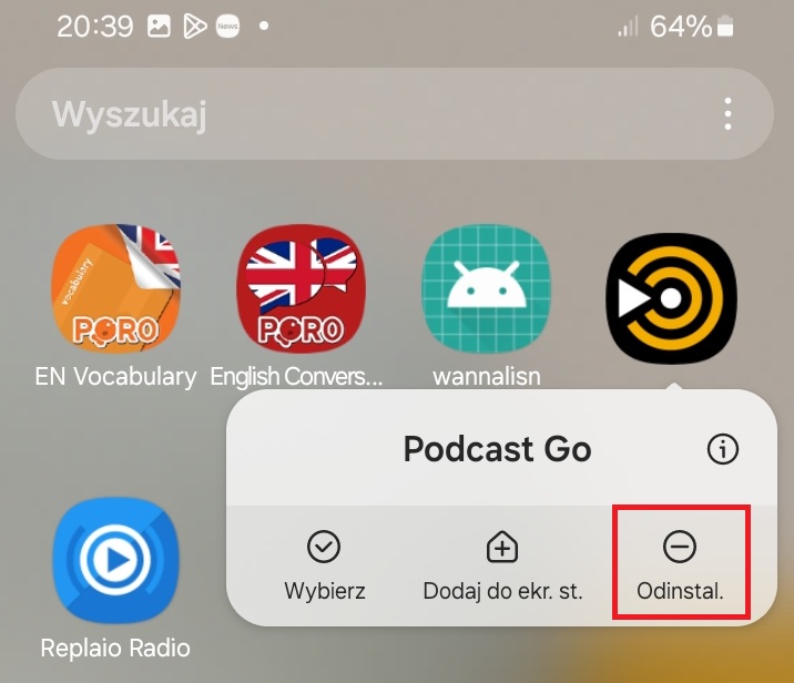 Gdyby coś poszło nie tak z metodą pierwszą poniżej pokaże drugi sposób jak odinstalować aplikację z Ustawień telefonu.