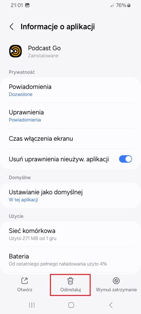 4. Otworzy się ekran z informacjami o tej konkretnej aplikacji. Na środku lub na dole ekranu powinien znajdować się przycisk (często z ikoną kosza) o nazwie „Odinstaluj”. Kliknij w to.