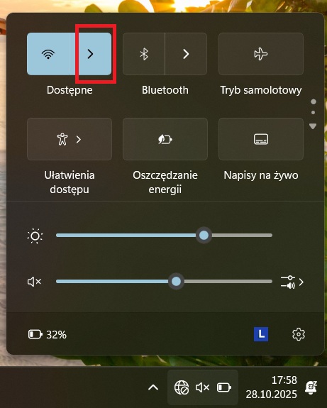 2. Po kliknięciu ikony otworzy się małe okienko z różnymi przełącznikami. Odszukaj w nim ikonę Wi-Fi (podobną do wachlarzyka) i kliknijcie strzałkę znajdującą się obok niej, aby zobaczyć wszystkie dostępne sieci.
