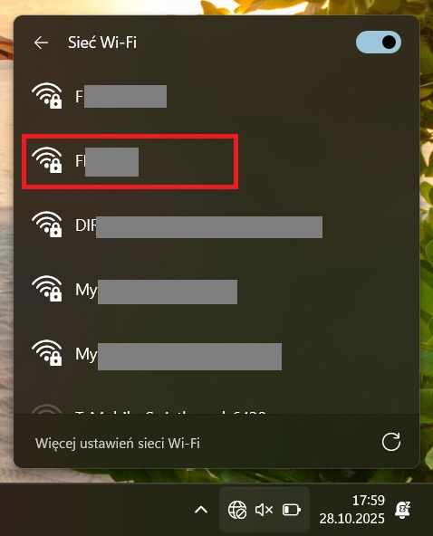 3. Na ekranie pojawi się lista wszystkich sieci Wi-Fi, które są w zasięgu komputera. Spokojnie odszukaj na niej nazwę swojej domowej sieci – tę, której nazwę odszukałeś na routerze lub nazwę przekazaną przez inną osobę. Kliknij w wybraną sieć.