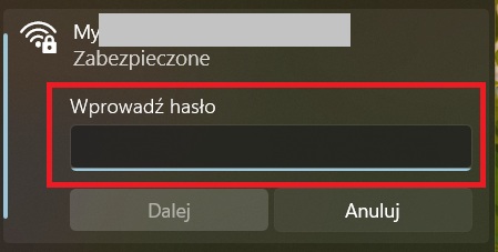 4. Po wybraniu nazwy sieci kliknijcie przycisk „Połącz”. System poprosi o podanie hasła. Wpisz je bardzo uważnie, zwracając uwagę na małe i wielkie litery, cyfry, a nawet znak specjalne. Po wpisaniu hasła kliknij Dalej.