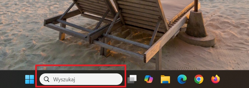 1. Na dole ekranu znajduje się pasek z ikonami (tzw. pasek zadań). Poszukaj ikony lupy lub paska z napisem „Wyszukaj” – tuż obok menu Start.