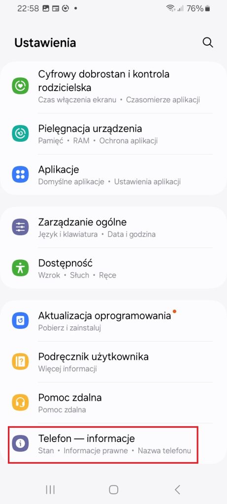 2. Zjedź na sam dół menu i wejdź w Telefon – informacje.