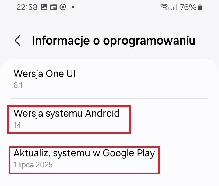 3. Teraz wybierz Informacje o oprogramowaniu. Zobaczysz tu wszystkie szczegóły, a wśród nich Wersję systemu Android – na przykład Android 14, a także z kiedy jest ostatnia aktualizacja bezpieczeństwa.