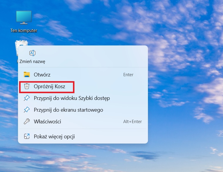 1. Kliknij prawym przyciskiem myszy na ikonę Kosza znajdującą się na Pulpicie