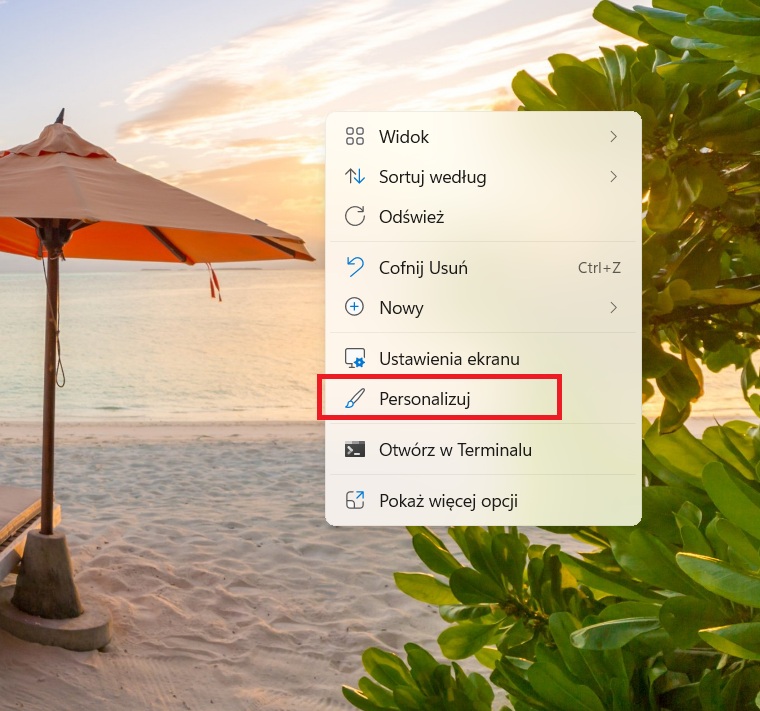 1. Zminimalizować wszystkie programy, a by był widoczny Pulpit. W wolną przestrzeń kliknij prawym przyciskiem myszy i po pojawieniu się menu wybierz Personalizuj.