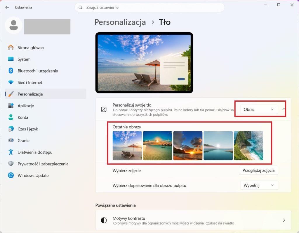 3. W tym kroku wybierzemy obraz, jednak warto zapoznać się z jeszcze jedną opcją do wyboru. Obok napisu „Personalizuj tło” znajduje się rozwijana lista. Mamy tu trzy główne opcje: