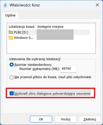 3. Otworzy się nowe okno o nazwie „Właściwości: Kosz”. W dolnej części okna zaznacz mały kwadracik (pole wyboru) przy którym widnieje napis: Wyświetl okno dialogowe potwierdzające usuwanie. Teraz kliknij Zastosuj i OK. Okienko zniknie, a Twoje ustawienia zostały właśnie zapisane.