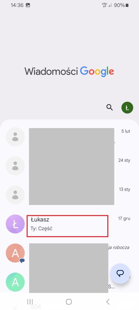 2. Możesz wejść w istniejącą już rozmowę lub utworzyć nową wiadomość. Aby zacząć nową, szukaj przycisku „Zacznij czat”, „Nowa wiadomość” lub ikonki plusa (+). Następnie na górze wpisz imię osoby z Twoich kontaktów lub numer telefonu. W poniższym przykładzie klikam na istniejącą wiadomość od kontaktu Łukasz.