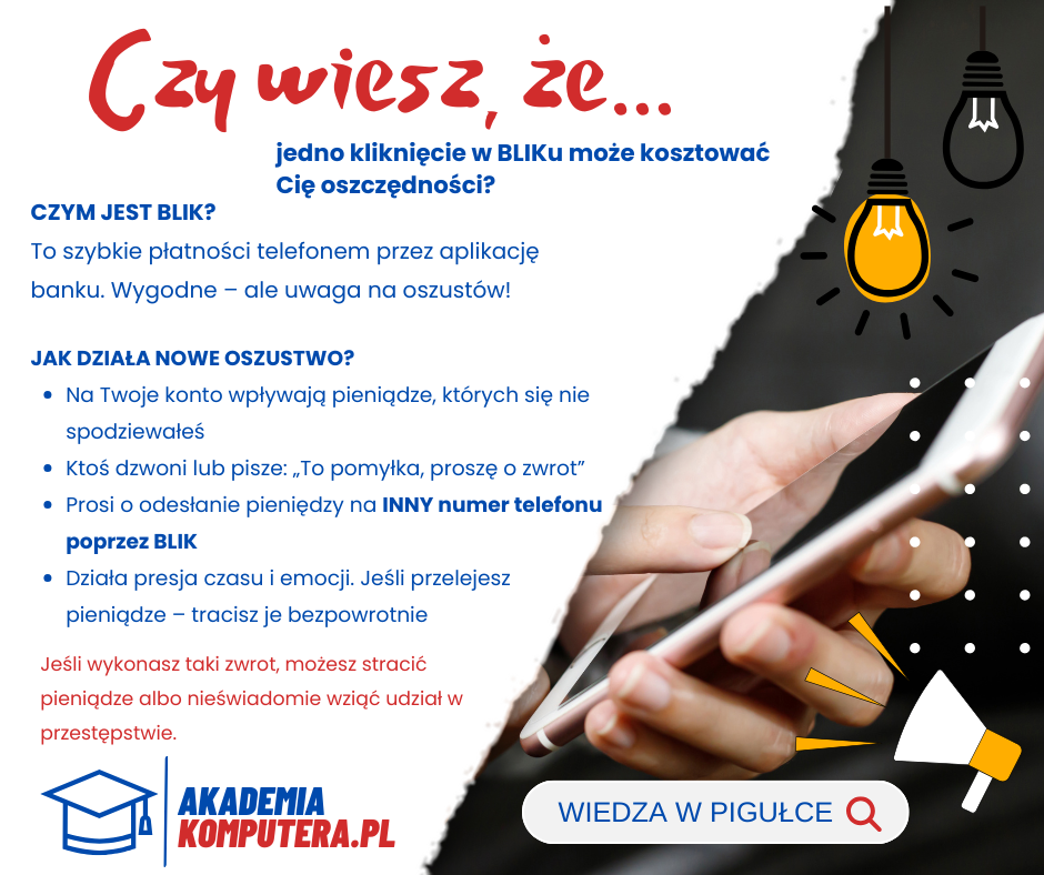 Jeśli wykonasz taki zwrot, możesz stracić pieniądze albo nieświadomie wziąć udział w przestępstwie. Dlatego nigdy nie odsyłaj pieniędzy na inny numer, nie działaj pod presją czasu i w takiej sytuacji zawsze skontaktuj się z bankiem. Ostrożność i spokój to najlepsza ochrona przed oszustami. BLIK jest bezpieczny, ale nie chroni Cię przed manipulacją. Zachowaj ostrożność.