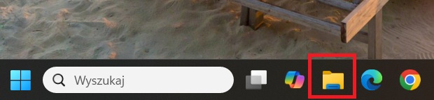 1. Naszą główną „szafą”, która pozwala na przeglądanie zawartości komputera jest program o nazwie „Eksplorator plików”. To właśnie w nim będziesz szukać wszystkich swoich dokumentów, zdjęć i folderów. Na Pasku zadań (to ten pasek na dole ekranu) poszukaj ikony wyglądającej jak żółta teczka. Kliknij w nią jeden raz lewym przyciskiem myszy.