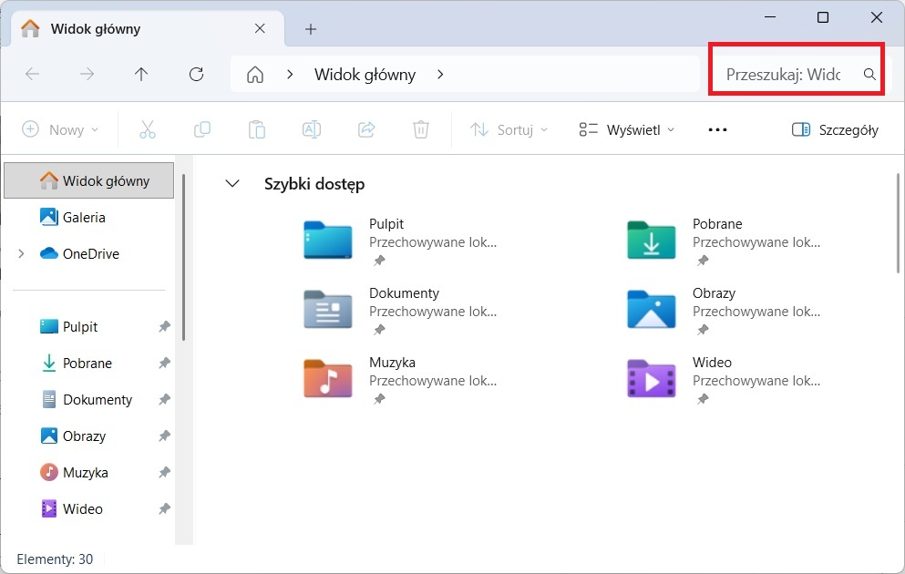 1. W górnej części okna Eksploratora plików znajduje się pole do wpisywania tekstu z lupą. Wpisz tam nazwę pliku (lub jej fragment), a komputer spróbuje go odnaleźć.