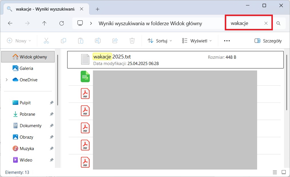 W poniższym przykładzie została wpisana fraza „wakacje”, gdyż taka nazwa pliku kojarzyła mi się z szukanym plikiem. Poniżej zostały wyszukane wszystkie pliki, które zawierają frazę „wakacje”. Pierwszy wiersz to szukany przeze mnie plik. Aby go otworzyć kliknij dwukrotnie lewym przyciskiem myszy.