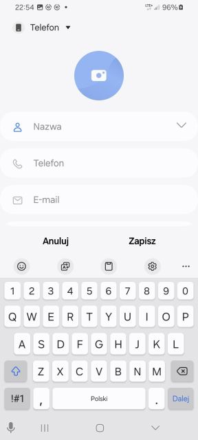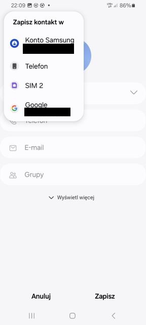 2. Wybierz gdzie chcesz, aby kontakt został zapisany. Do wyboru masz: Konto Samsung (jeżeli się zarejestrowałeś), telefon, karta SIM oraz konto Google. Wybrałem, aby kontakt został zapisany w telefonie.