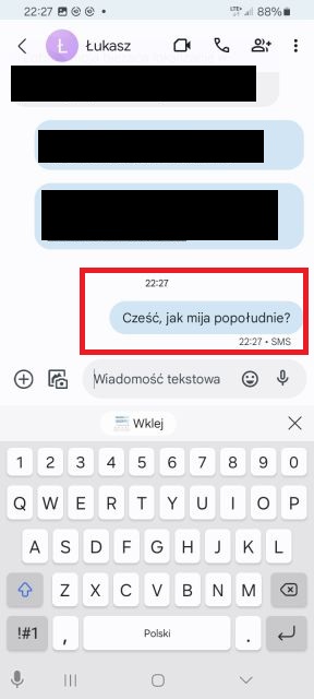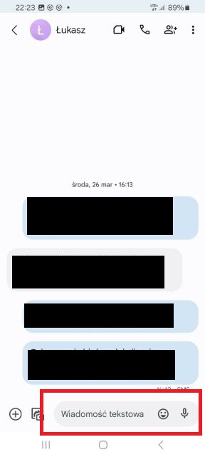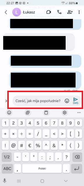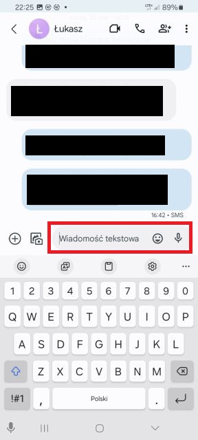 4. W polu tekstowym znajdującym się na dole kliknij, aby wprowadzić treść swojego sms-a – na dole pojawi się również wirtualna klawiatura. Aplikacja oferuje również dodatkowe funkcje, takie jak propozycje słów, korekta tekstu oraz możliwość dodania emotikon lub naklejek.