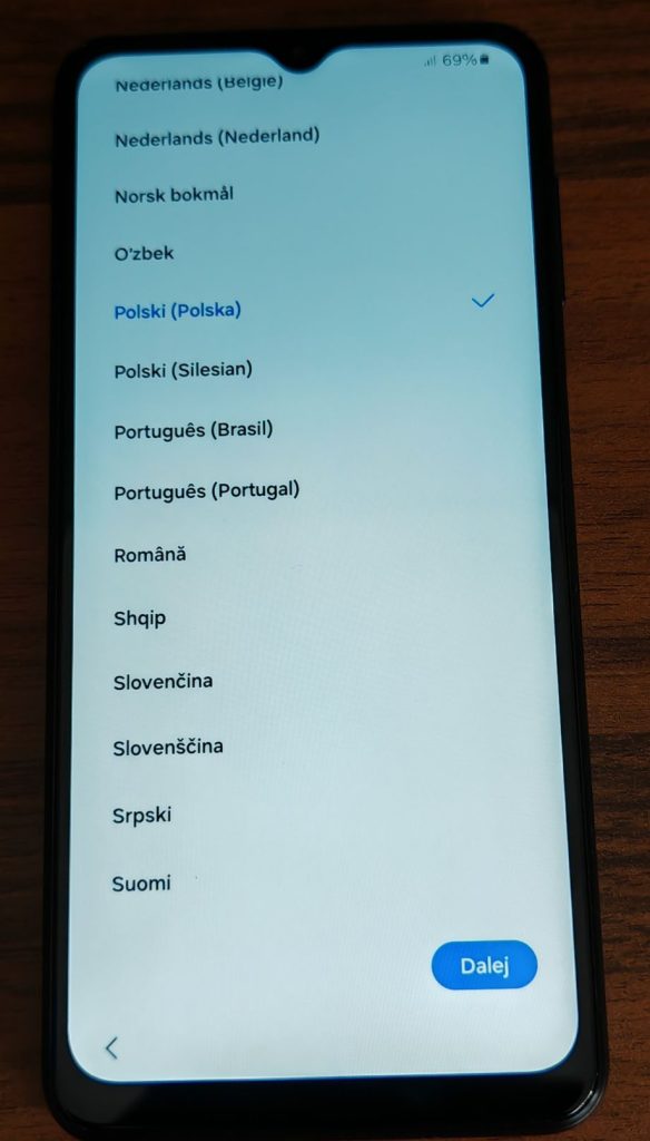 3. Po pojawieniu się ekranu powitalnego wybierz preferowany język interfejsu. Stuknij Dalej, aby przejść do kolejnego kroku.