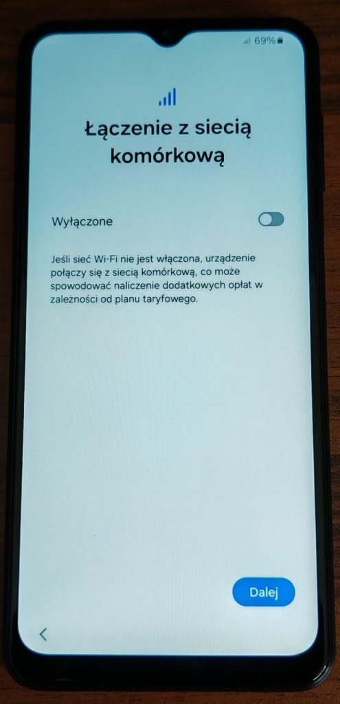 4. Domyślnie transmisja danych w telefonie jest wyłączona. Przełącznikiem należy ją włączyć. Stuknij Dalej.