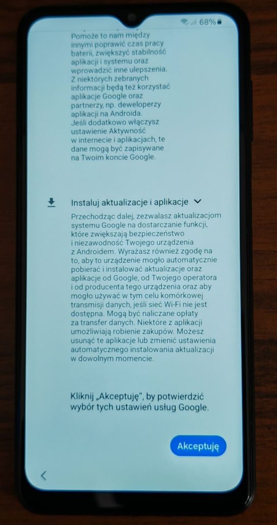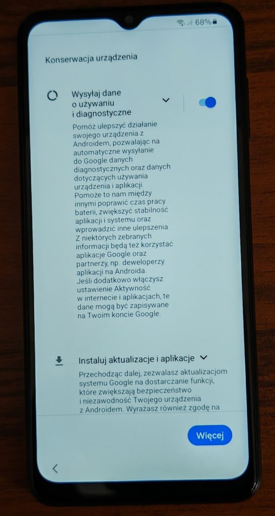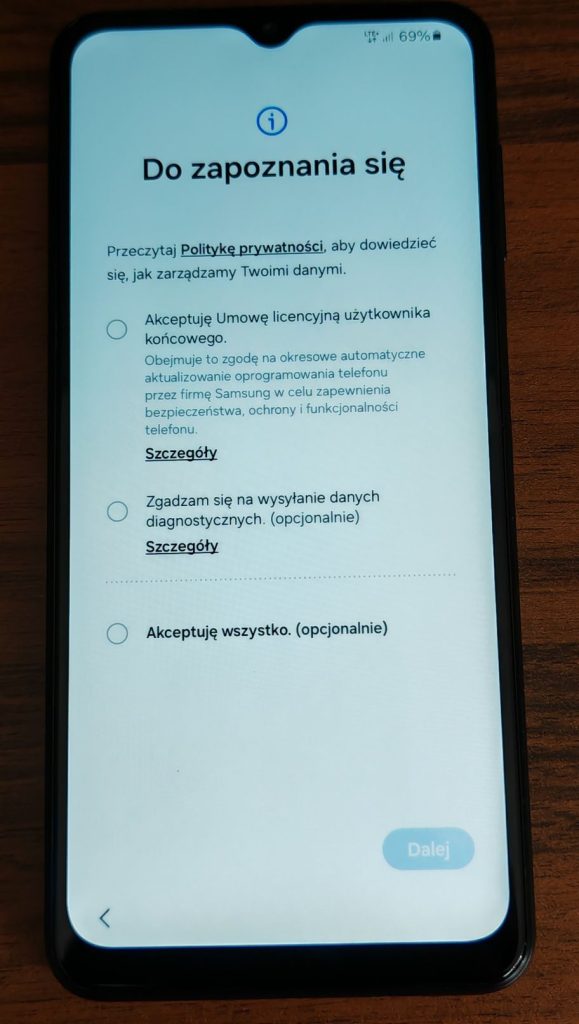 5. Kolejny krok to akceptacja umowy licencyjnej. Jeżeli chcesz udostępniać dane diagnostyczne możesz zaznaczyć drugą opcjonalną opcję. Stuknij Dalej.