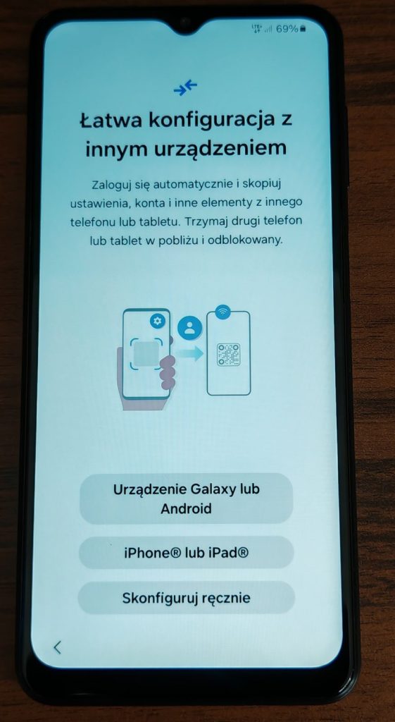 6. Kolejny krok to możliwość skopiowania danych ze starego telefonu tworząc bezpośrednie połączenie. W przypadku gdy chcemy skopiować dane z innego telefonu lub tabletu z Androidem wybierz pierwszą opcje. W przypadku skopiowania danych z telefonu z iPhone lub iPad wybierz drugą opcję. Jeżeli nie chcesz nic skopiować z poprzedniego telefonu wybierz trzecią opcje – „Skonfiguruj ręcznie”.