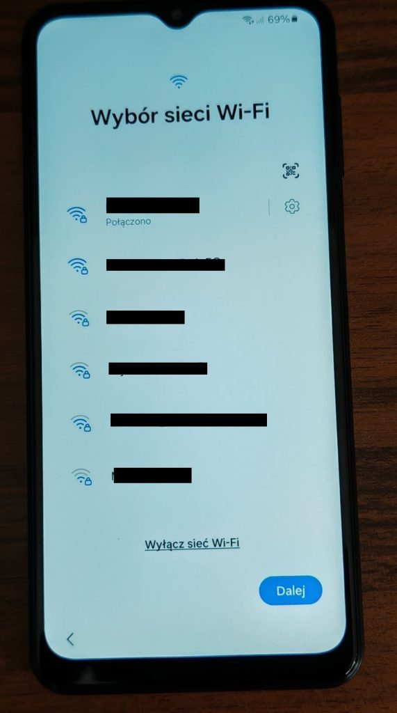7. Wybierz swoją sieć Wi-Fi i wpisz hasło. Po wykonaniu tych czynności stuknij Dalej.