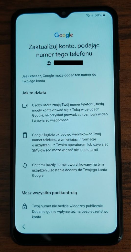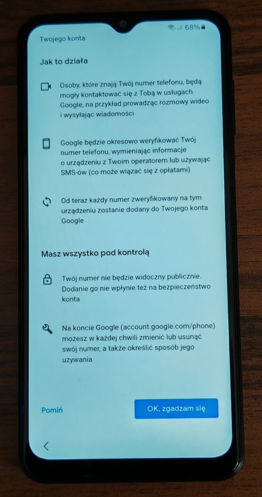 12. Teraz przeczytaj informacje przesuwając palcem do góry…. i stuknij OK, jeżeli chcesz aby Twój numer telefonu został dodany do konta Google. W przeciwnym razie wybierz Pomiń.