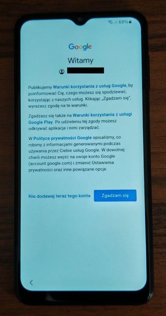 13. W kolejnym oknie musisz zatwierdzić warunki korzystania z konta Google. Zatwierdź przyciskiem Zgadzam się.