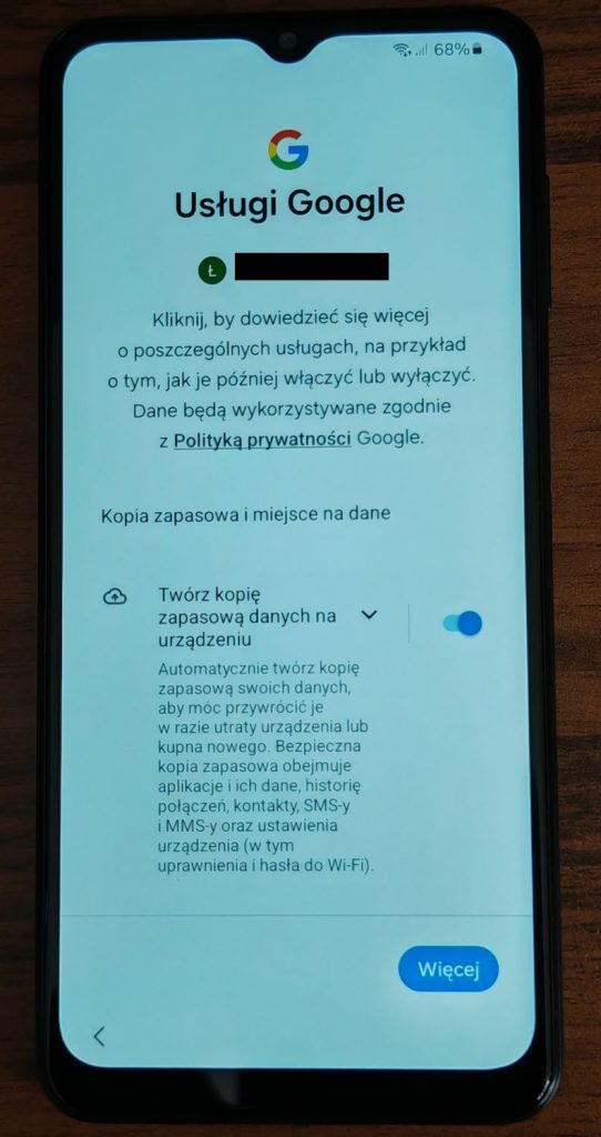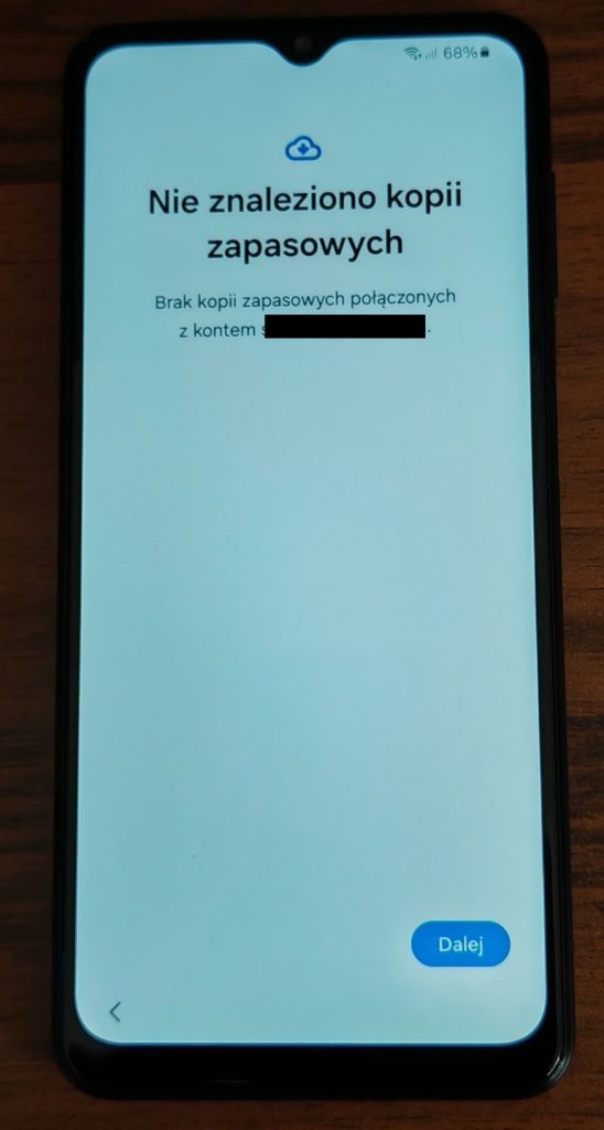 15. Jeżeli na poprzednim telefonie była wykonana kopia zapasowa telefonu poprzez konto Google w tym miejscu powinna pojawić się informacja. Jeżeli kopia nie została utworzona lub konto jest nowe pojawi się jedynie monit że brak kopii zapasowej. Stuknij Dalej.