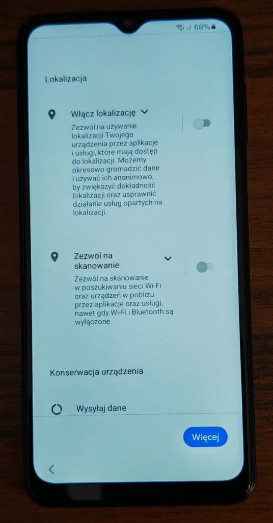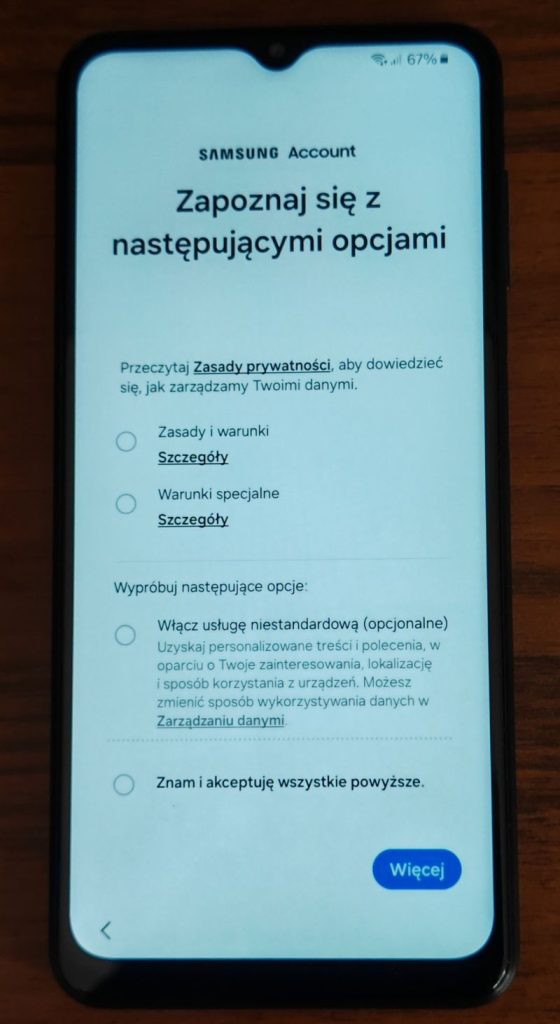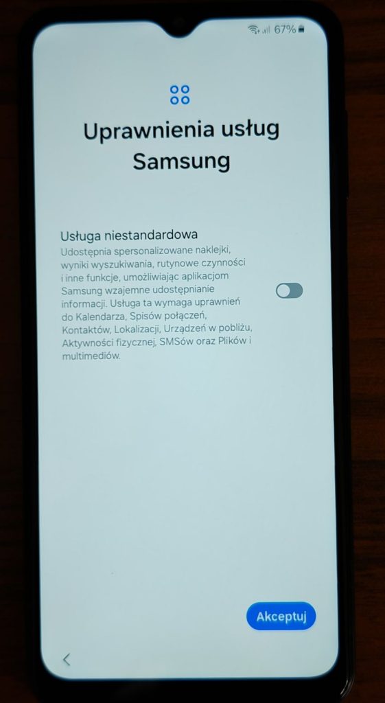 31. Kolejne okno to uprawnienia usług Samsung. Przeczytaj uważnie co zostanie udostępnione. Opcję te można zostawić wyłączoną.