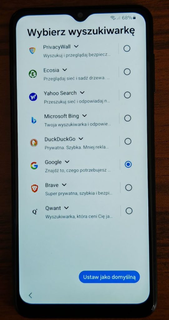 19. Wybierz domyślną wyszukiwarkę. Możesz wybrać Google lub inną dowolną wedle preferencji. Wybierz przycisk Ustaw jako domyślną.