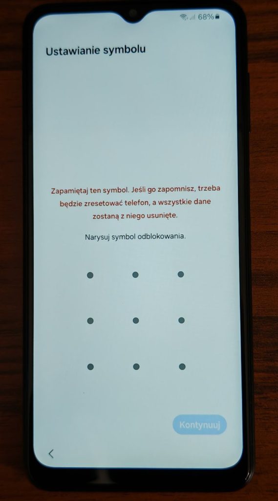 Postępuj zgodnie z instrukcjami wyświetlanymi na ekranie, aby ustawić wybrany sposób zabezpieczenia telefonu. Poniżej przykładowo ustawienie wzoru (ustawienie symbolu). Dwukrotnie trzeba będzie potwierdzić wybrany wzór.