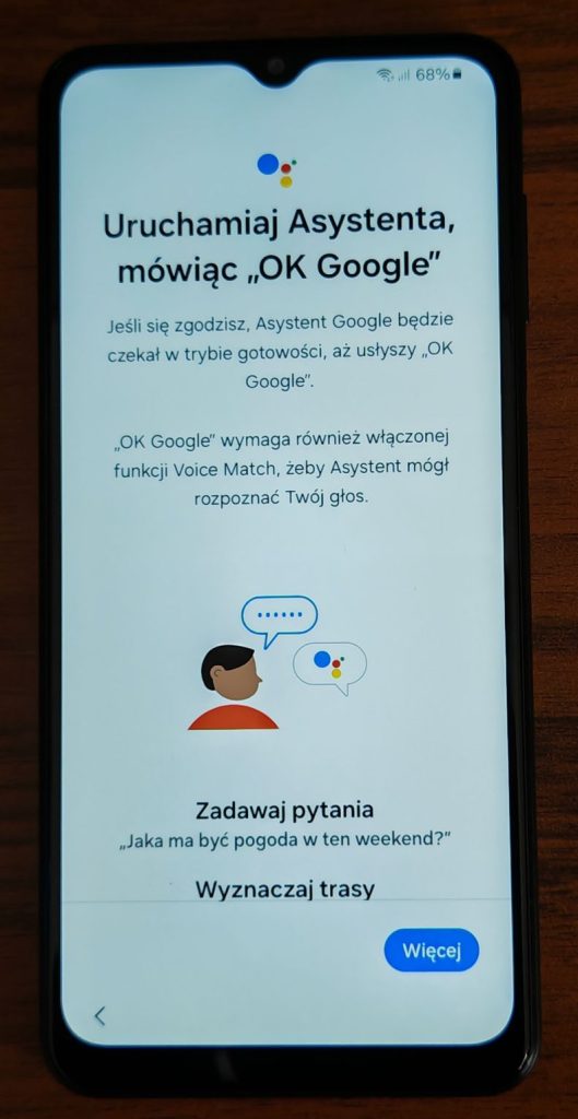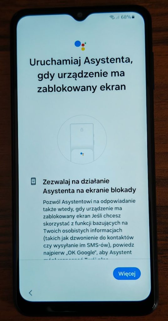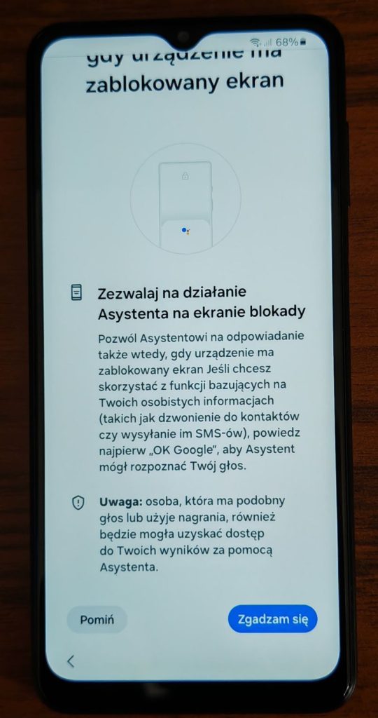 22. I ostatnie pytanie dotyczące asystenta czy może się uruchamiać podczas gdy telefon jest zablokowany. Wybierz właściwą opcję według własnych preferencji. Przesuwając palcem do góry. Na poniższych zrzutach wybrałem opcję Pomiń.