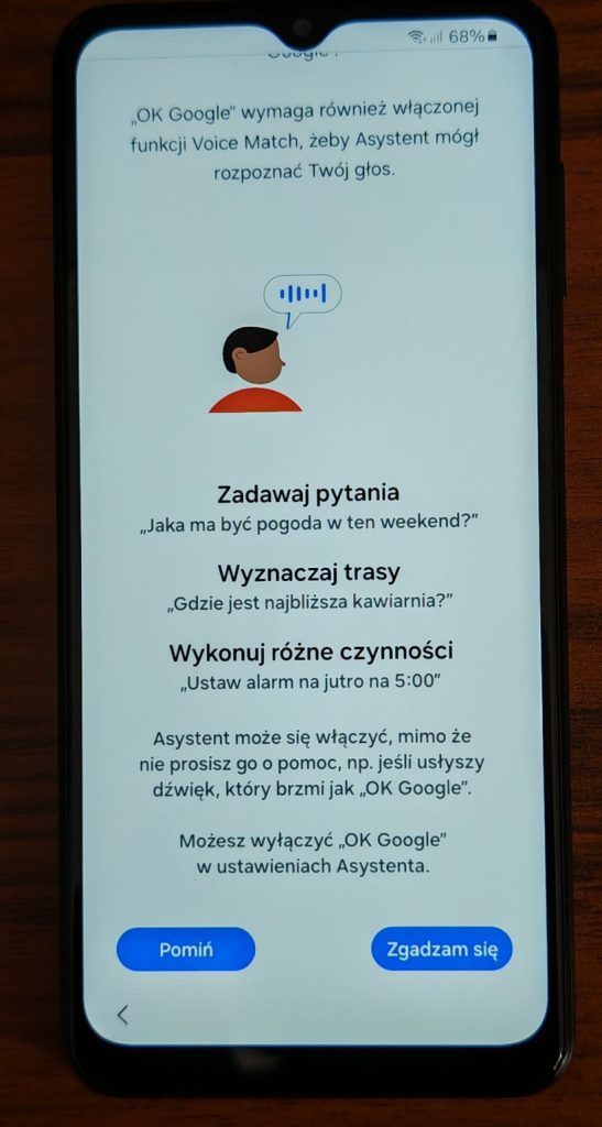 21. Kolejny ekran to opcja uruchomienia asystenta Google. Jeżeli chcesz go uruchomić wybierz Zgadzam się, jeżeli jednak na tym etapie nie potrzebujesz włączyć tej opcji, wybierz Pomiń. W każdym momencie można to zmienić w ustawieniach telefonu. Na poniższych zrzutach wybrałem Pomiń.