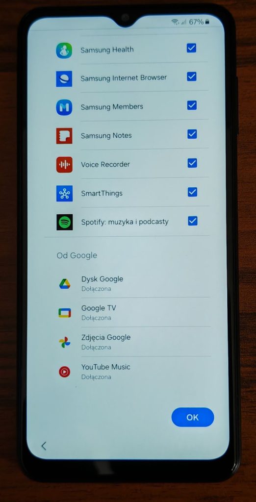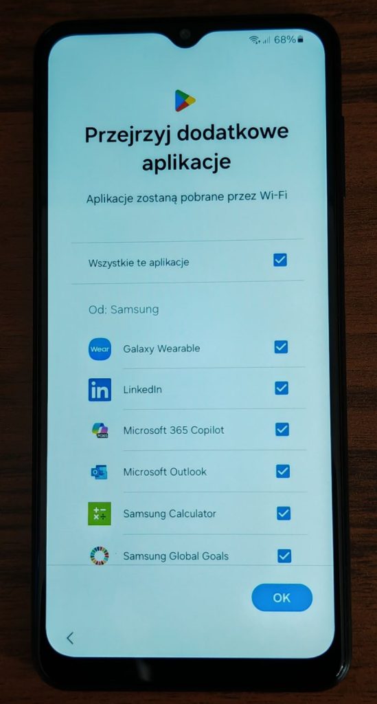23. Następny ekran to wybór dodatkowych aplikacji, które możesz zainstalować w telefonie. Domyślnie wszystkie są zaznaczone – można odznaczyć klikając na „Wszystkie te aplikacje” lub po prostu zaznaczyć te które Cie interesują. W każdym momencie można je zainstalować z poziomu Sklepu Play – w kolejnych artykułach opiszę jak to zrobić krok po kroku. Przewiń i stuknij OK.