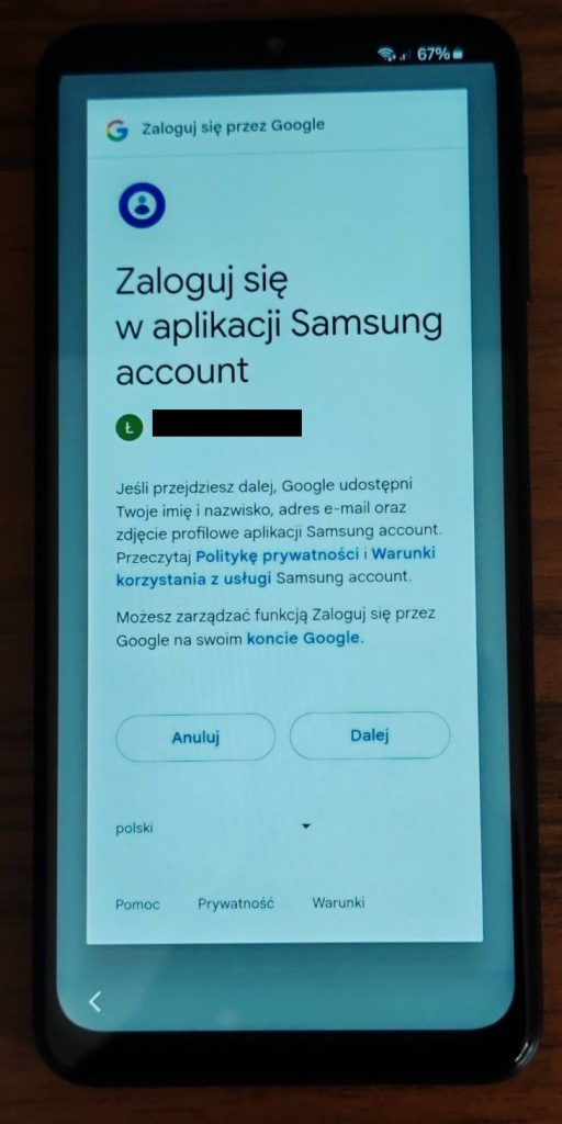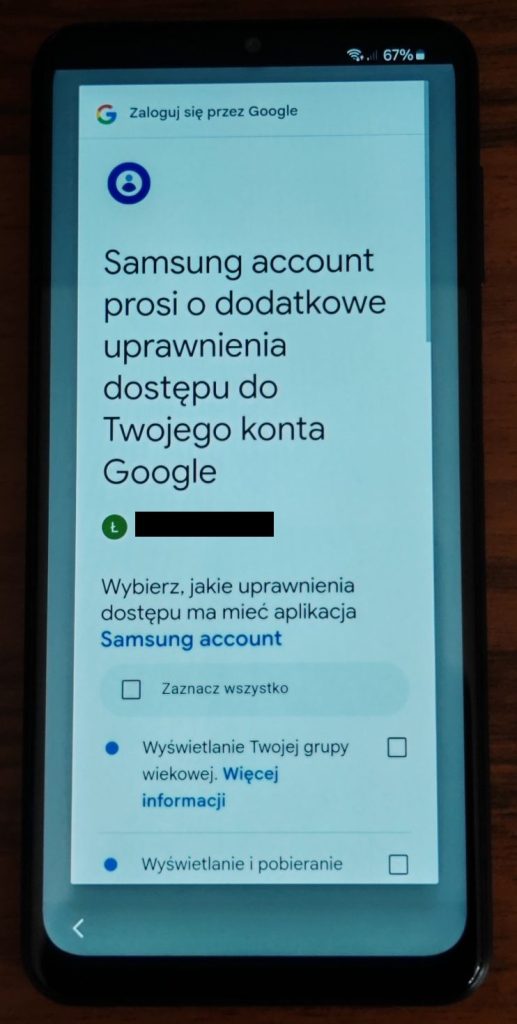 26. Jeżeli wybrałeś zalogowanie się do konta Samsung poprzez pierwszą opcję „Zaloguj się przez Google” powinny pojawić się poniższe opcje.