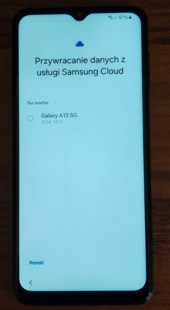 29. Jeżeli Twój wcześniejszy telefon to był Samsung i była wykonana kopia zapasowa jest możliwość przywrócenia danych za pomocą konta Samsung. W tym oknie należy zaznaczyć kropkę przy nazwie modelu lub wybrać Pomiń. W poniższych zrzutach zaznaczyłem nazwę modelu.