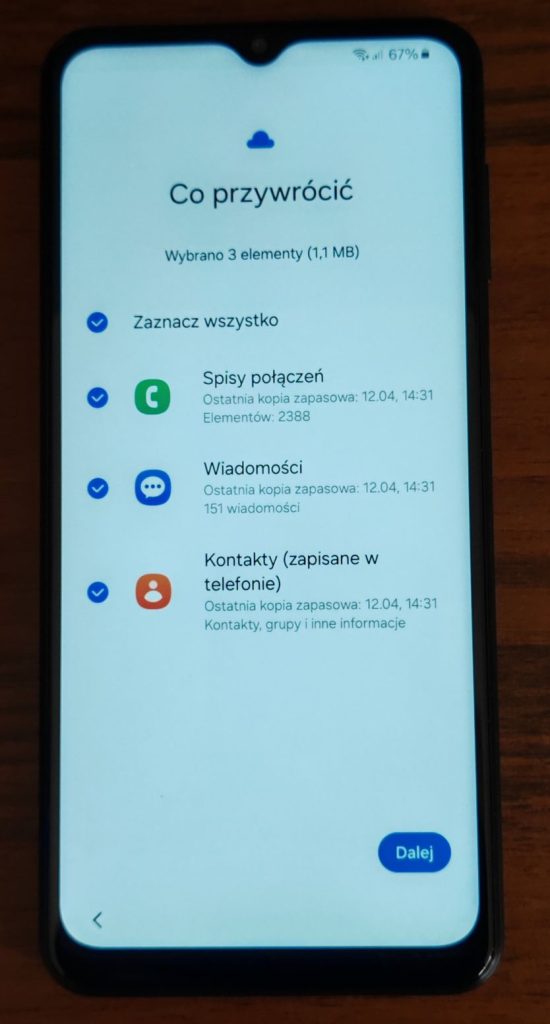 30. Zaznaczyłem opcje przywrócenia i rozwinęło się okienko co mogę przywrócić z poprzedniego telefonu. Stuknij Dalej.