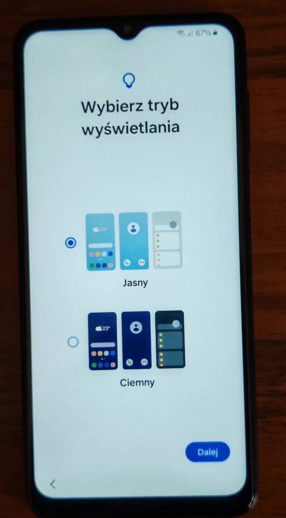 32. Na następnym ekranie mamy do wyboru tryb ciemny lub tryb jasny wyświetlania ekranu telefonu. Tryb jasny ma jasne tło i ciemny tekst, co sprawdza się w dobrze oświetlonych miejscach. Tryb ciemny działa odwrotnie – ciemne tło i jasny tekst, co jest lepsze dla oczu w słabym świetle i może oszczędzać baterię na ekranach OLED.