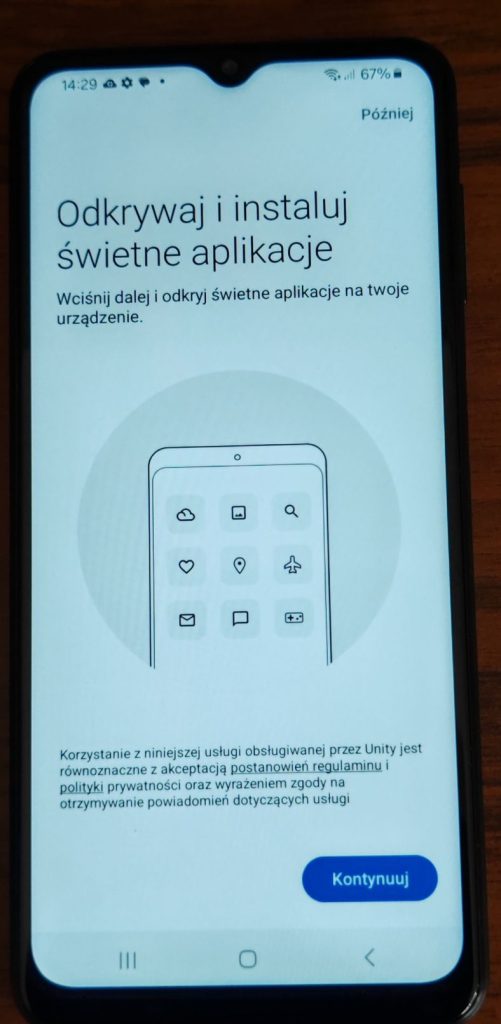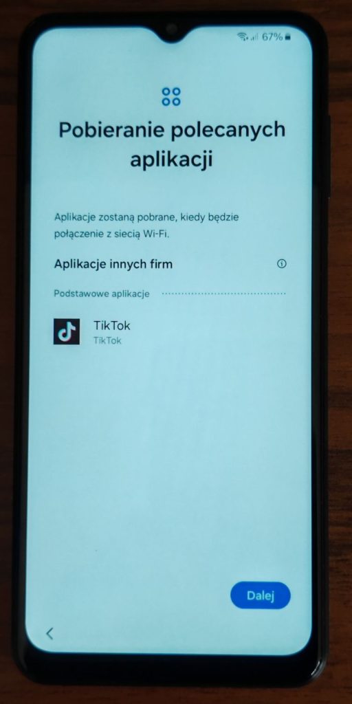 34. Kolejne okno w telefonie Samsung to pobieranie polecanej aplikacji. Niestety nie ma tu możliwości odmowy pobierania aplikacji. Mamy możliwość stuknięcia Dalej. Dopiero po uruchomieniu telefonu możemy tę aplikację odinstalować.